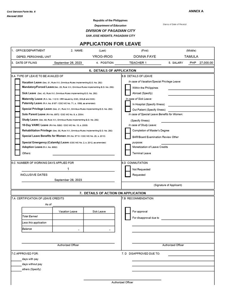 Revised application for leave (form 6) download 8) by barry jessie digol november 8, 2023 A) type of leave [ ] vacation [ ] to seek employment [ ] others (specify) Explore educational excellence with deped division of bukidnon. Vacation leave within in the philippines or abroad shall be indicated in the form for purposes of securing travel authority and.