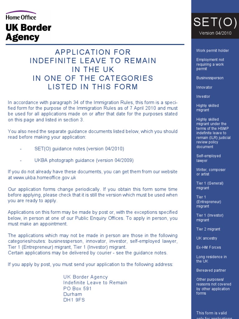 SET (O) Application For Indefinite Leave To Remain in The Uk in One