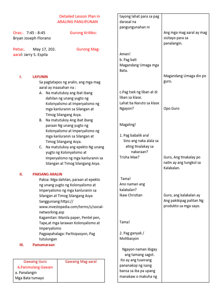 Detailed Lesson Plan Format Deped Filipino Printable Templates Free