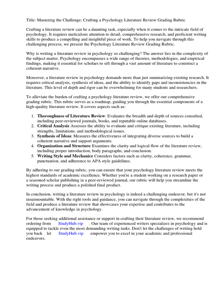 Psychology Literature Review Grading Rubric PDF