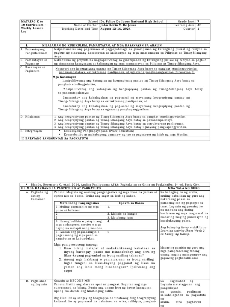 Access grade 8 lesson exemplars (le) and learning activity sheets (las) and explore how lesson exemplars and learning. Grade 7 araling panlipunan lesson exemplar le_ap 7_q1_week1_final.pdf le_ap 7_q1_week2_final.pdf le_ap. The matatag lesson exemplar format is a comprehensive guide designed to assist educators in crafting engaging and effective.