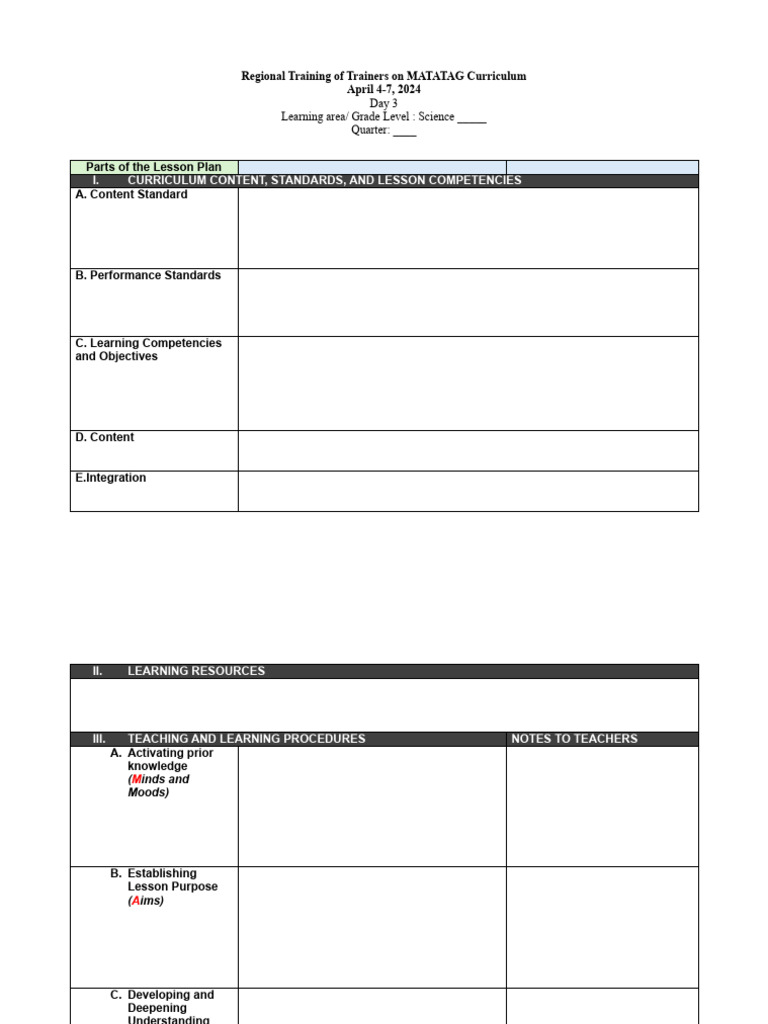 Lesson plans guide instruction, support classroom management, and help teachers meet diverse student needs. This document outlines a standard lesson plan structure under the matatag curriculum, adaptable across kindergarten to grade 10. The matatag curriculum introduced by the department of education (deped), is a redesigned educational framework. This article compiles a comprehensive list of free resources, including grade 6 matatag.