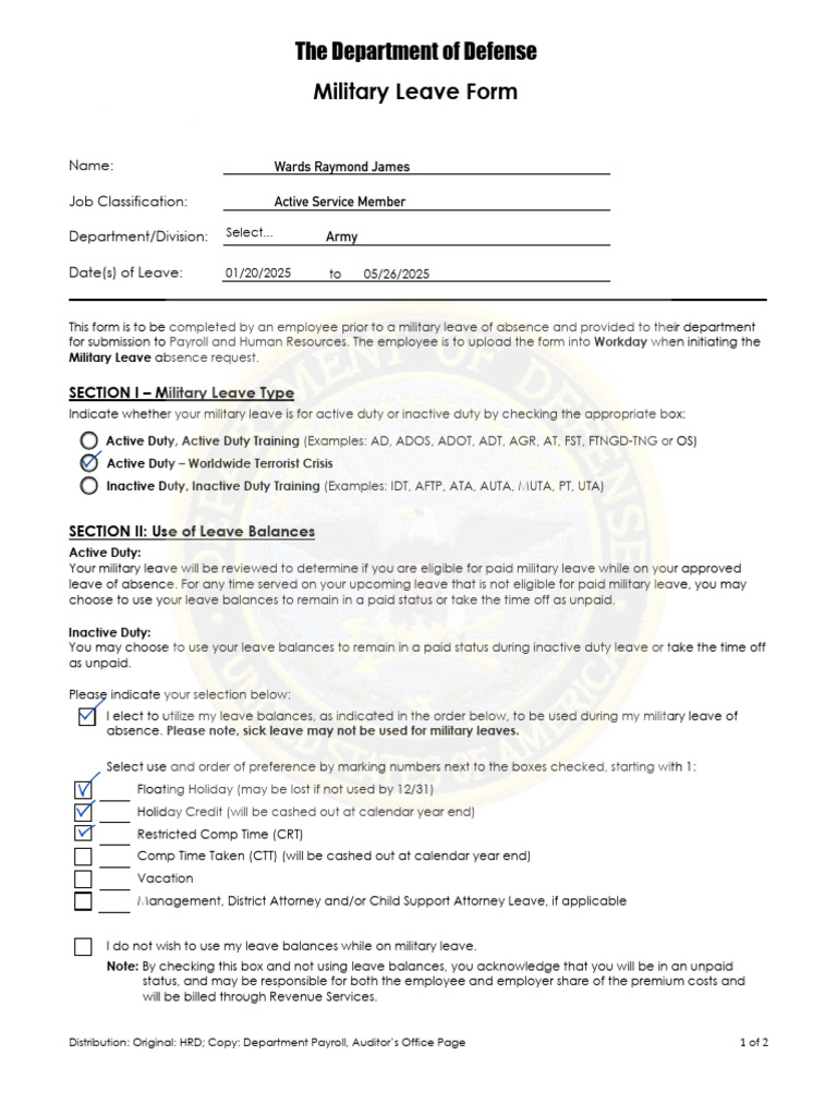 Military Leave Forms For Employers - Subject to the rules and exceptions discussed below, userra guarantees an employee returning from military service or training the right to be. Employees may be entitled to certain rights and benefits, and may have certain obligations, related to service in the uniformed services pursuant to. The family and medical leave act (fmla) provides that eligible employees may take fmla leave for a qualifying exigency while the. After my paid military leave is exhausted (check one):