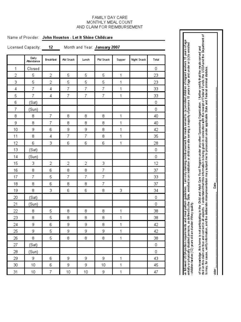 Cacfp Meal Count Worksheet