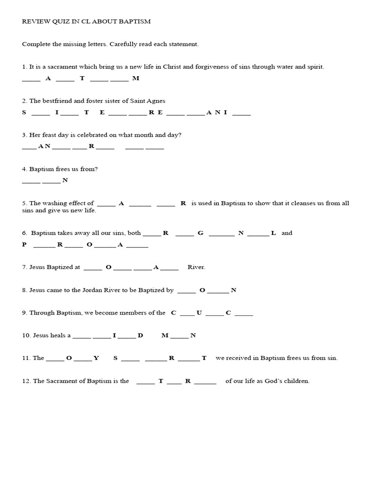 This is an excellent multiple choice bible quiz of your knowledge about water baptism by immersion. Thousands of games, quizzes, and lots more! 1 when does a person become a christian? Every non baptized person, whether a child or an adult, is eligible for for baptism. Without defending any one theological position, this quiz surveys various baptismal.