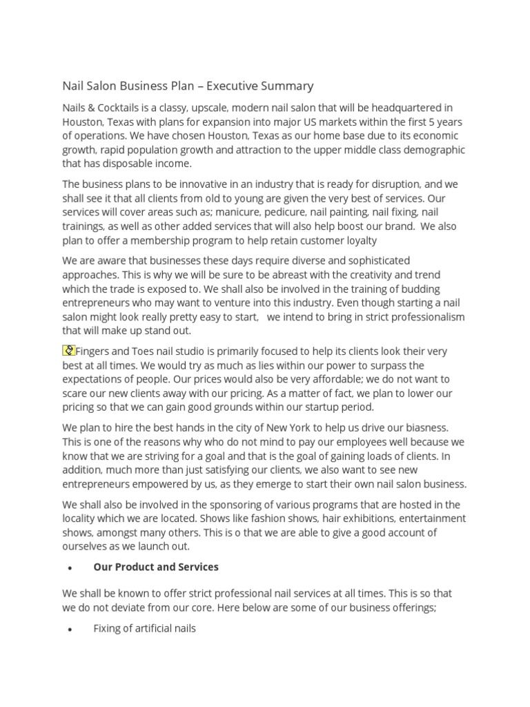 10k+ visitors in the past month Learn how to create a nail salon business plan with our guide, including key sections and a downloadable pdf template for reference. The essence of having a nail salon business plan is to help you achieve the nail salon’s goals, assist to get financing by attracting potential.