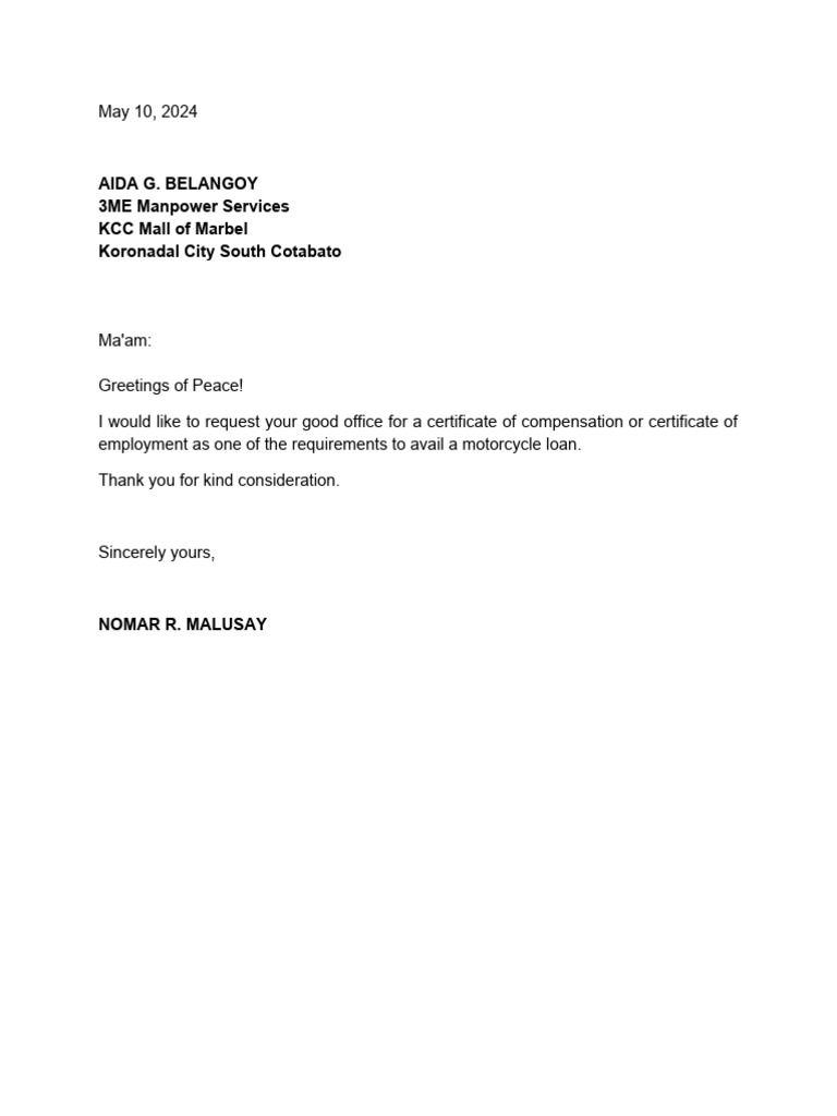 Sample Letter Requesting Salary Slip Certificate From Your Office, Company, Or Employer.