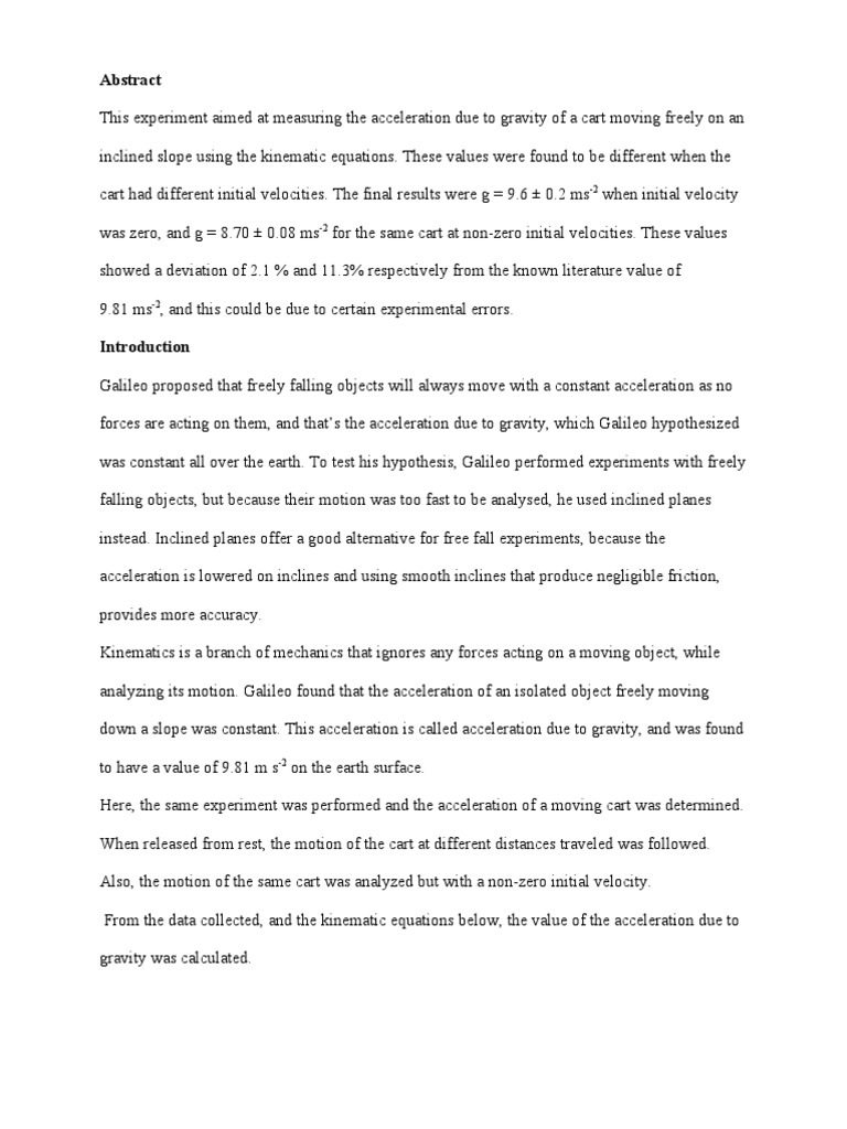 Sample Physics Lab Report Kinematics PDF Acceleration Gravity