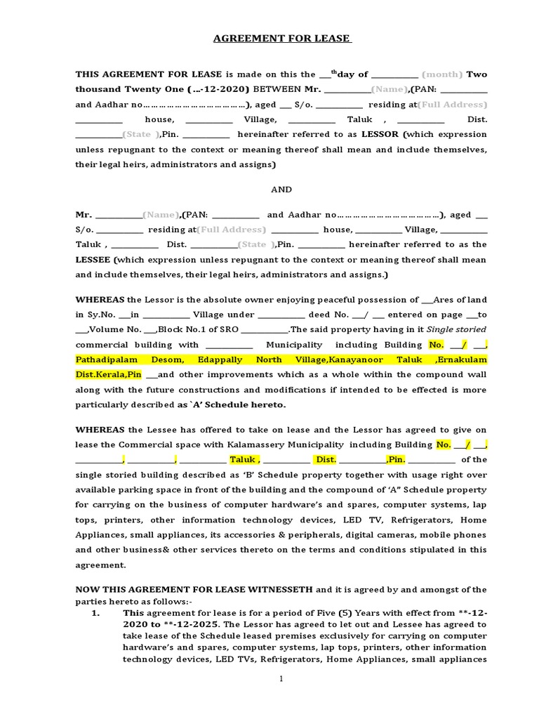 AGREEMENT FOR LEASE Kerala Model PDF Lease Renting