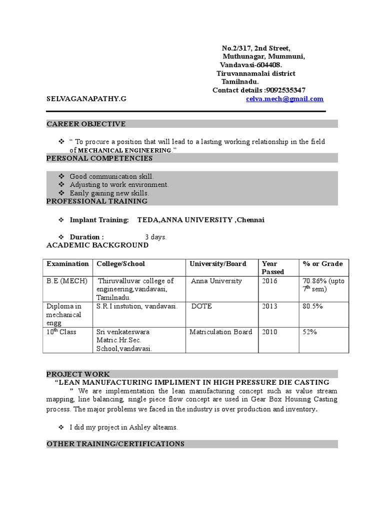 Selva Resume PDF Tamil Nadu