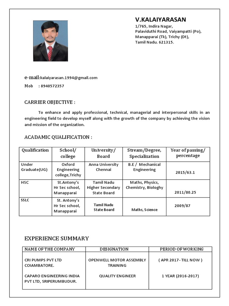 Sample Resume Format For Tamil.