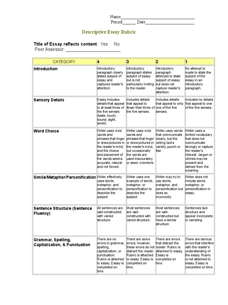 Rubric For Descriptive Essay Title PDF Essays Writers