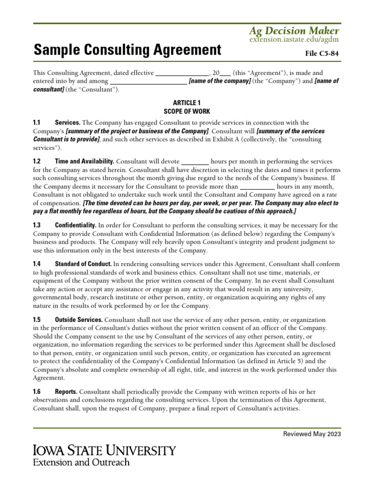A sample agreement for consulting services between a company and a faculty member of the university of rochester. Consultant will render services and advice to company on the projects (“projects”) on attachment a, which may be modified from. In rendering consulting services under this agreement, consultant shall conform to high professional standards of work and business. Protects client interestseasy to.