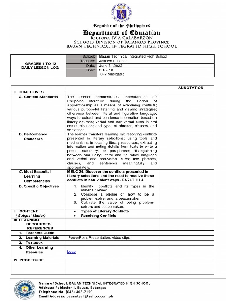 Callang national high school grade level: Grades 1 to 12 daily lesson log school: