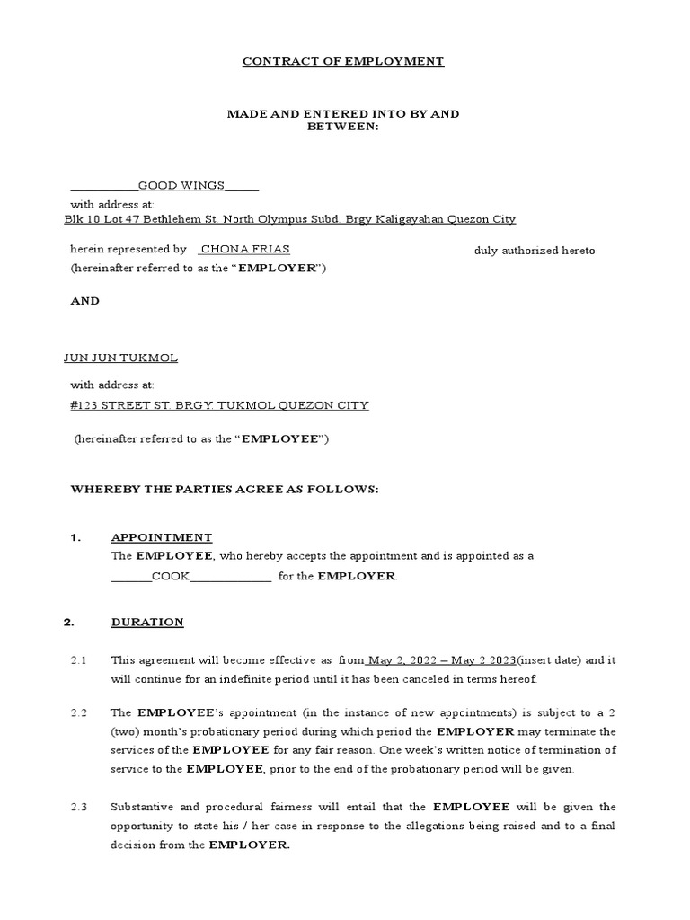 Contract of Employment Sample Philippines PDF Overtime Employment