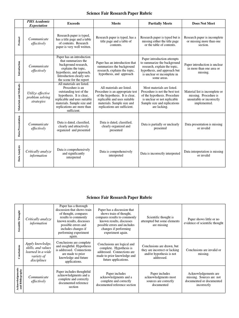 Science Fair Research Paper Rubric PHS Academic Expectation Download
