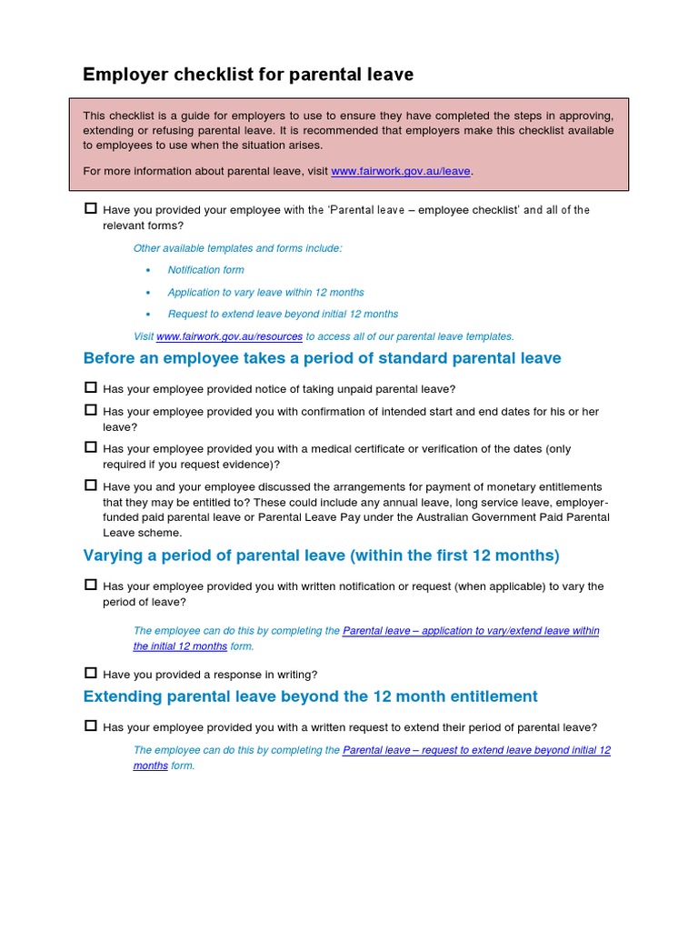 Parental Leave Employer Checklist PDF Parental Leave Labor