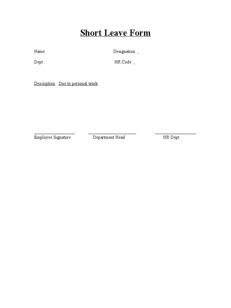Short Leave Form Name Designation Dept. HR Code PDF