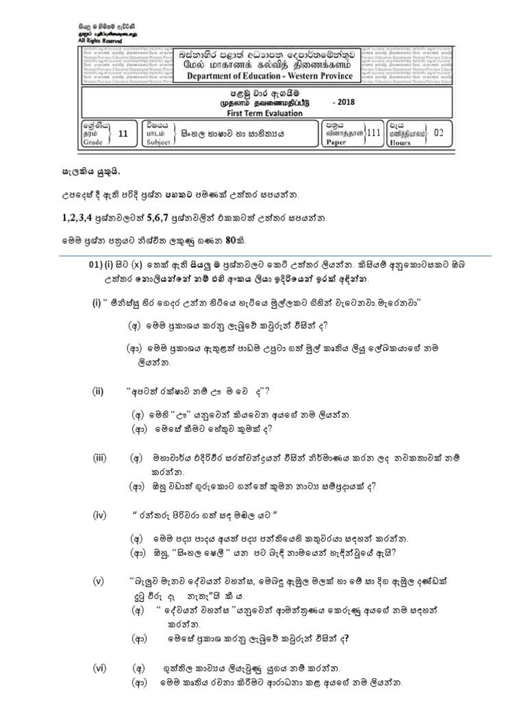 Sinhala 1st Term 2018 Western Province Past Paper Part 3 PDF