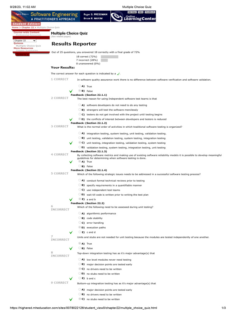Quiz Ans Chapter22 PDF Software Testing Multiple Choice