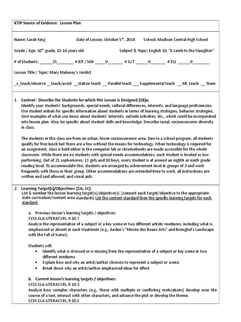 Sarah King Lesson Plan R5 PDF Special Education Lesson Plan