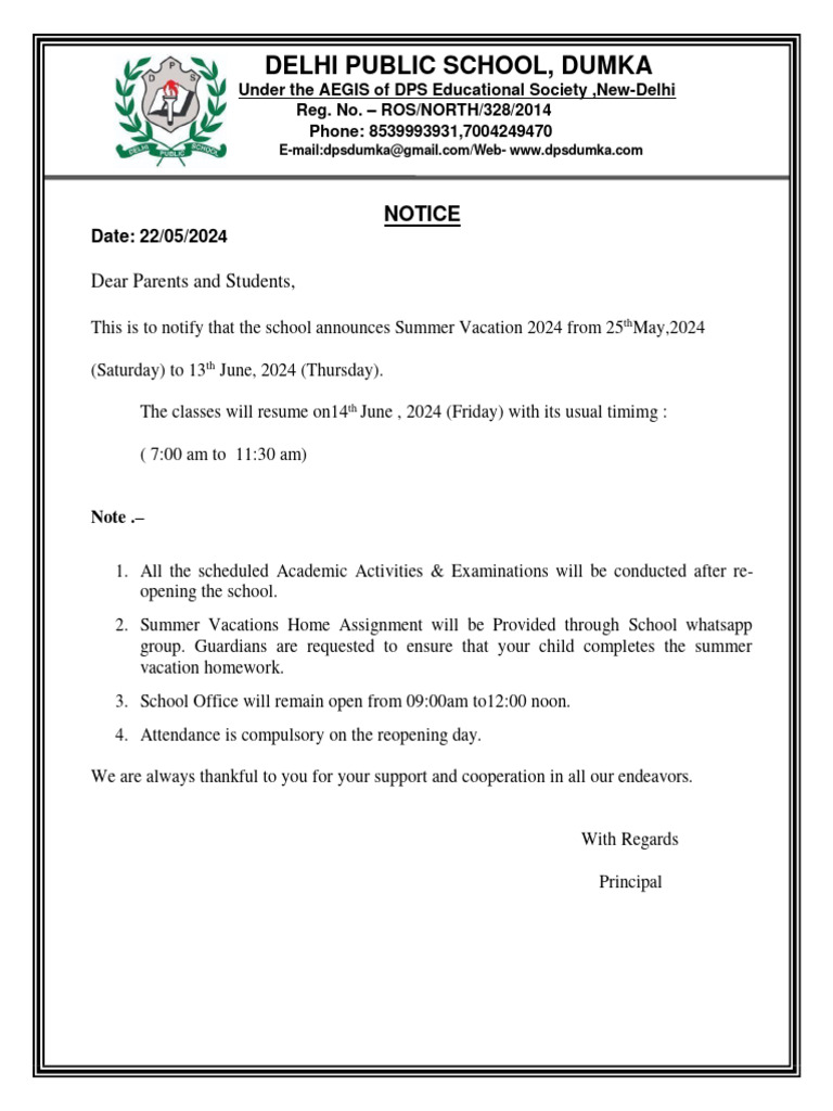 It is hereby notified that the following sitting arrangements are made for the summer vacation 2024 (i.e.