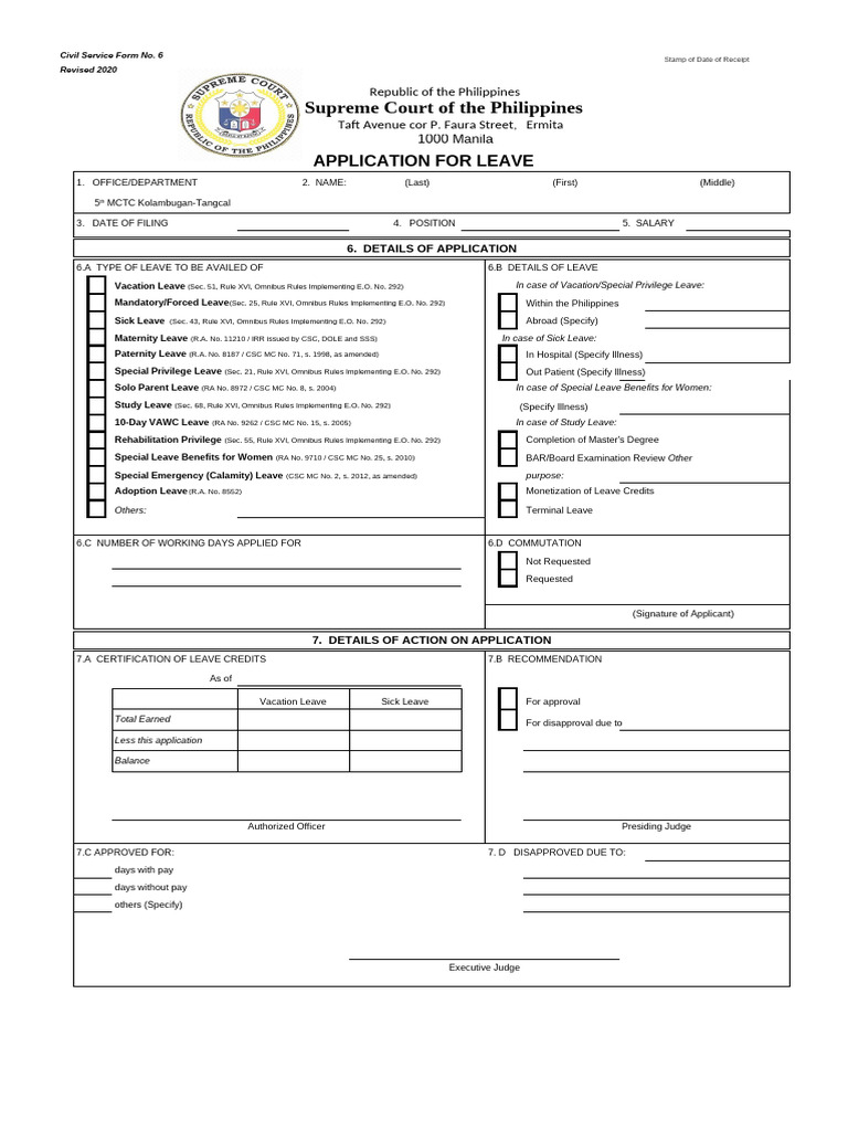 Vacation leave within in the philippines or abroad shall be indicated in the form for purposes of securing travel authority and completing. The forms available for completion online are those. Where can i find court approved forms? The following forms can be completed online and printed for submission to the court. Leave adoption/childbirth leave application (court of appeals) disability application.