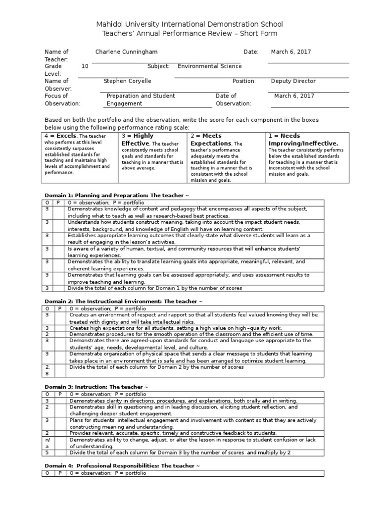 Sample Teacher Evaluation For Performance