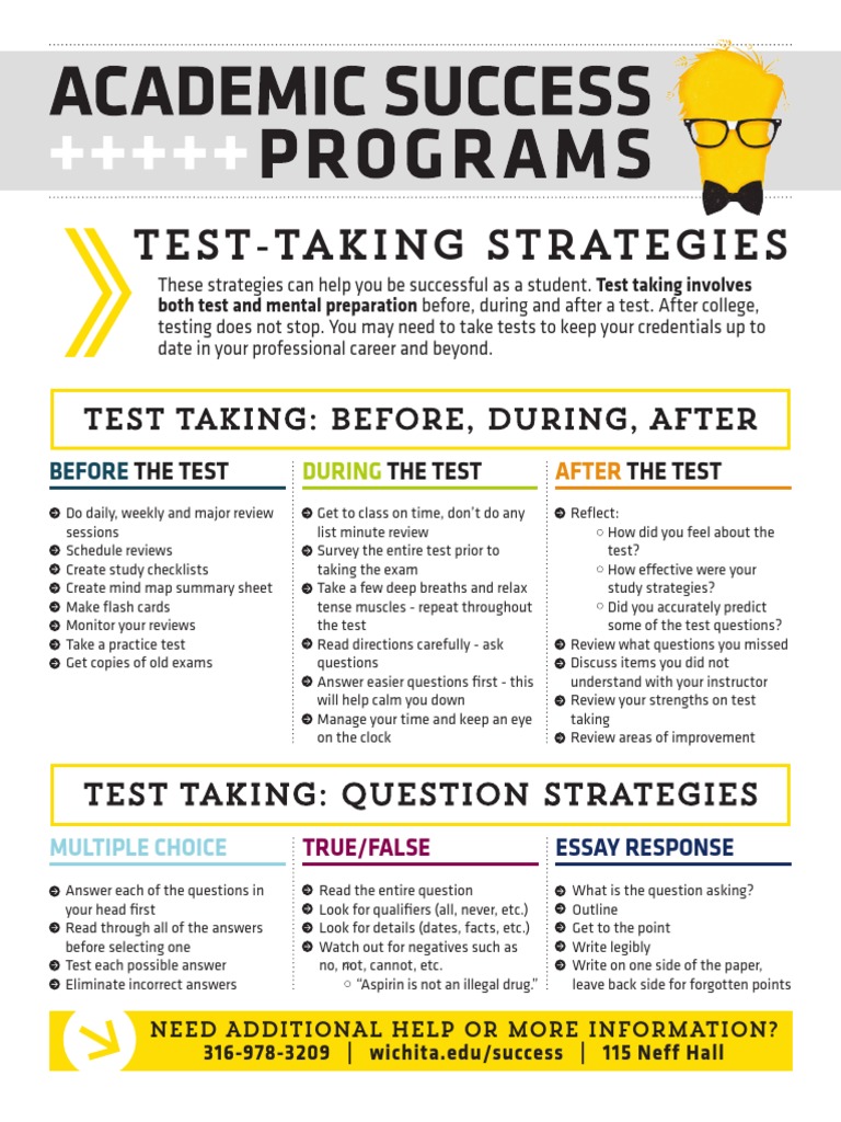 Guessing strategies are not a substitute for good study habits and test preparation. Find tips on how to follow directions, eliminate wrong. Learn 15 test taking strategies for math, language arts, science, and social studies tests. Test taking strategies staley (2009) use the following strategies to improve your test taking skills and to help you do your best on your..