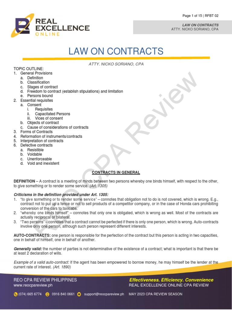 The civil code of the philippines defines how a contract is created, and it requires three elements. Classes of contracts in philippine law classes of contracts in philippine law (a doctrinal overview under the civil code, special.