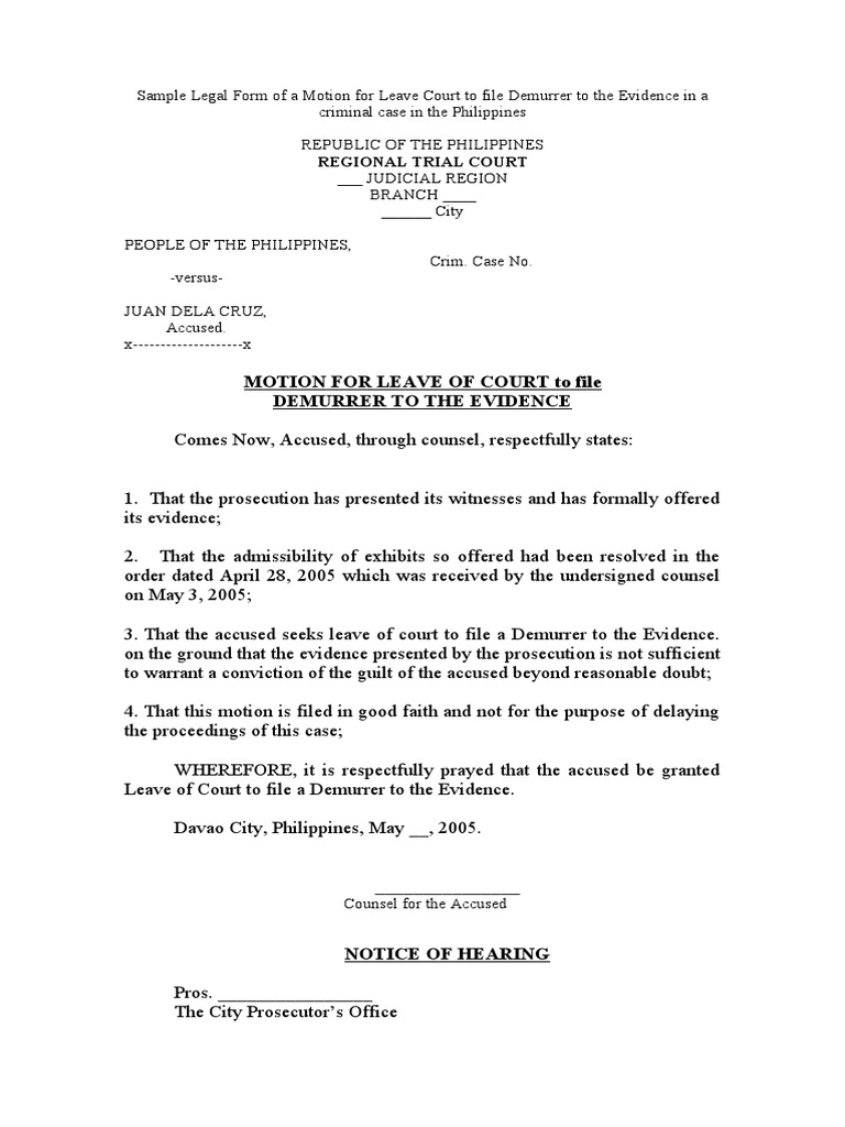 SOLUTION Sample motion for leave of court to file demurrer to evidence