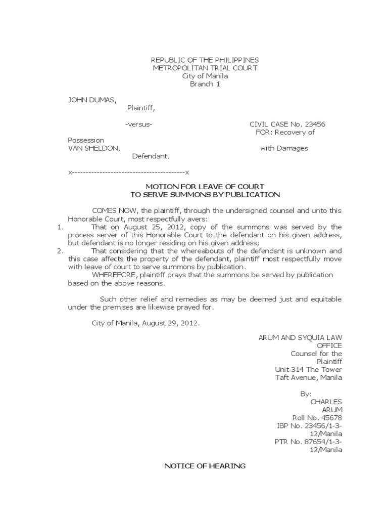 Motion With Leave of Court To Allow Service of Summons Publication Padu